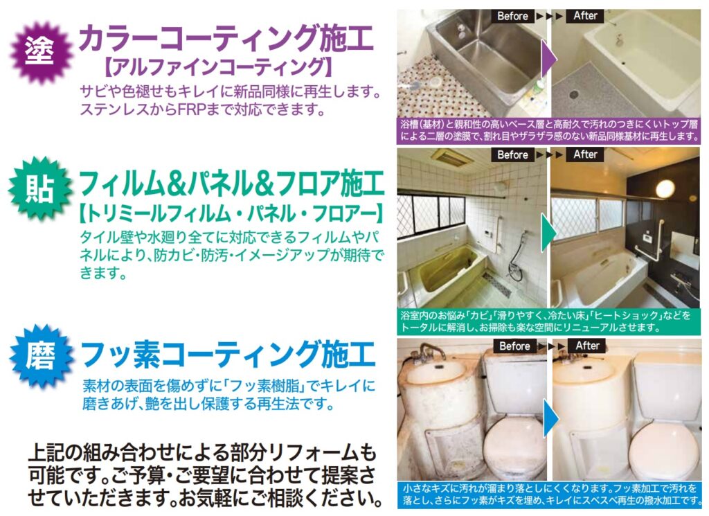 交換・解体しない工法のため低コスト・短期間での施工が可能です。無料のお見積りができますので、お電話 070-9026-8261 またはこちらからお気軽にご相談ください。